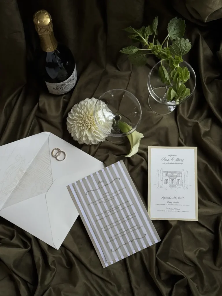 Vom feinen Papier der Einladung bis zur Menükarte. Jedes Schriftstück ist ein Teil des Designs und steigert die Vorfreude eurer Gäste.